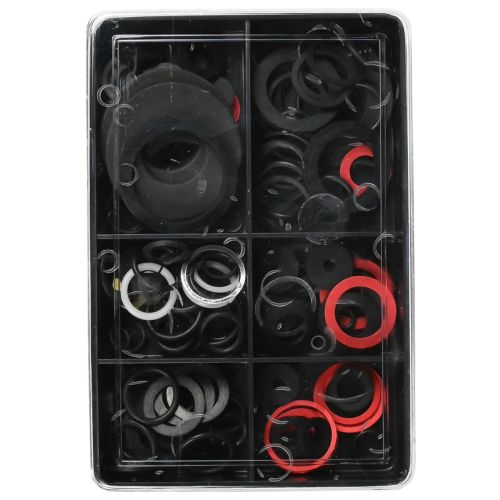Includes 125 pieces across different materials and sizes – covering O-rings, rubber washers, fibre washers, foam seals, tapered seals, and metal clips.