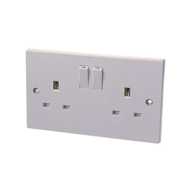 - A 13A 2 Gang White Moulded Plastic Square Edge Switched Sockets to BS1363 complete with 38mm Nickel Plated Screws.