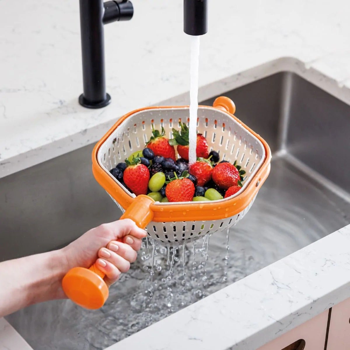 Salad Whizz is, first and foremost, a colander. Use the large 2.4l capacity to strain and drain any wet foods from boiled veg like potatoes, broccoli and cauliflower or cabbage, to hot food that you want to rest and steam and drip dry before roasting. Just place it in your sink, or over a bowl if you want to collect the water and pour your veg straight in. The generous holes will allow all that water to drain off in seconds and the dishwasher-safe construction means cleaning it is easy.