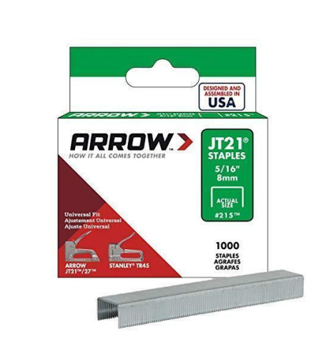 Arrow™ JT21 8mm (5/16”) staples are genuine Arrow™ fasteners, designed and assembled in the USA. Made of heavy duty steel, these staples will last you a long time and will hold your closet lining, window screens, and anything else secure. The JT21 staples feature extreme versatility as they can fit the JT21 and JT27 gun tackers in addition to other Arrow™ products, the PowerShot 5650, and most Stanley light duty stapler models. They can be used for light home projects and small crafts such as window shades and shelf papers. Other uses include valances, shelving, and headboard coverings. Each package contains 1000 pieces.