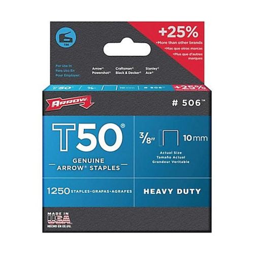 Arrow™ T50 staples are America’s best selling heavy duty staples. As always, these genuine Arrow™ fasteners are designed and assembled in the USA. Made of heavy duty steel, these staples will last you a long time and will hold your fabric, padding, wiring, and anything else secure. The T50 staples feature extreme versatility as they can fit many different Arrow™ products in addition to PowerShot, Craftsman, Black & Decker, Stanley, and Ace models. They can be used for light and heavy duty home projects such as installing window screening, upholstering furniture, attaching insulation, and pinning down wire. Other uses include roofing felt, housewrap, weather stripping, and carpeting. Each package contains 1250 pieces.
