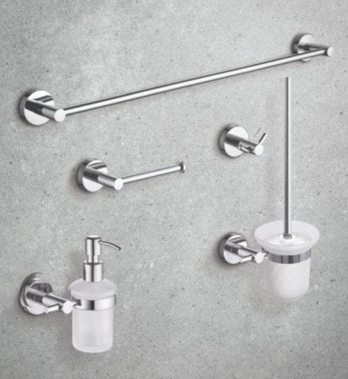 Rote set: robe hook, single towel bar, toilet paper holder, soap dispenser, toilet brush holder.