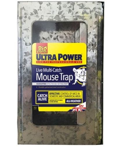 The Ultra Power Live Multi-Catch Mouse Trap from The Big Cheese® provides effective control of mice in homes, farms and commercial premises without the use of poisons – just like the professionals use. The trap is machined from industrial strength galvanised steel to ensure years of reliable service. The clear inspection lid allows at-a-glance trap inspection and is hinged for easy cleaning and live release. The unique low profile of the trap enables it to be sited beneath counters and pallets, as well as within shallow ceiling voids and cavities. It is suitable for use in both indoor and outdoor areas and where poison baits and snap traps may be a hazard, eg. in kitchens or around children and pets. The trap is self-setting and can catch up to 10 mice at a time.