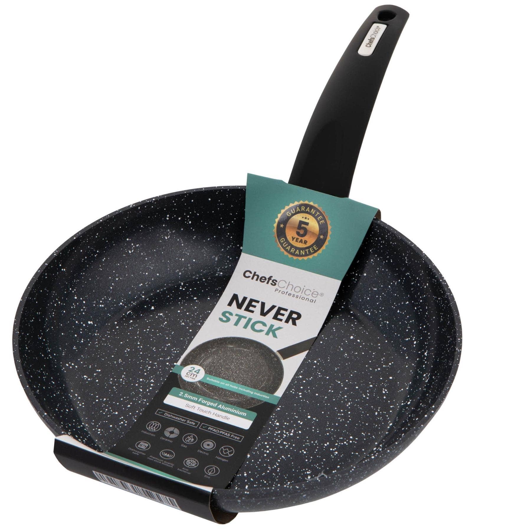 Cook with confidence using the Chefs Choice Non Stick 24cm Ceramic Frypan, designed for durability, performance, and everyday convenience. Made from forged aluminium with a PFAS- and PFOA-free non-stick base, it provides healthier cooking with less oil and effortless food release. Suitable for all hob types including induction, this versatile frypan features an ergonomic heat-resistant handle, making it safe and comfortable to use. Backed by a 5-year guarantee, it’s dishwasher safe and easy to clean, combining professional quality with everyday practicality.