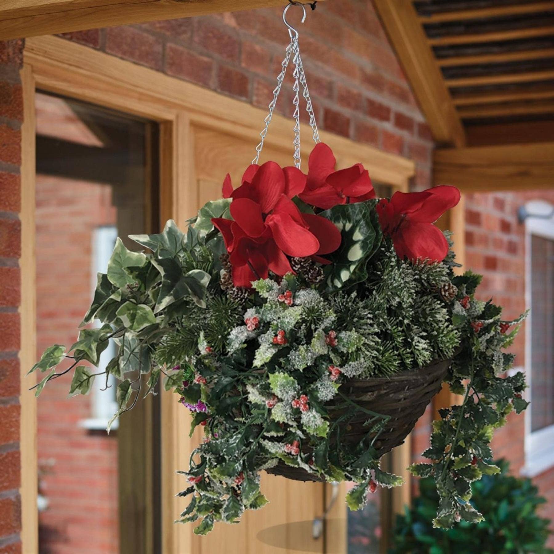 Classic Christmas Flower Hanging Basket 30cm – Festive Artificial Outdoor and Indoor Decoration