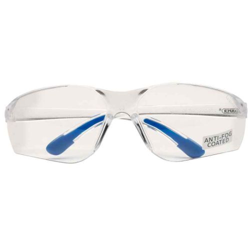 Lightweight safety glasses with clear polycarbonate wrap-around anti-scratch and anti-fog lenses. Fitted with a soft rubber nose piece and rubber-tipped arms achieving a secure and comfortable fit.