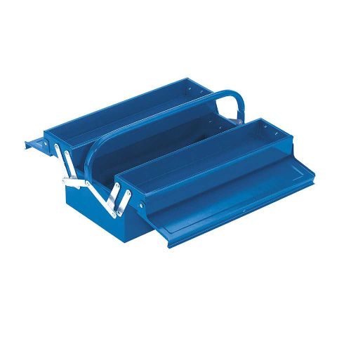 - General purpose tool box manufactured from sheet steel with tubular handles and lacquered finish.