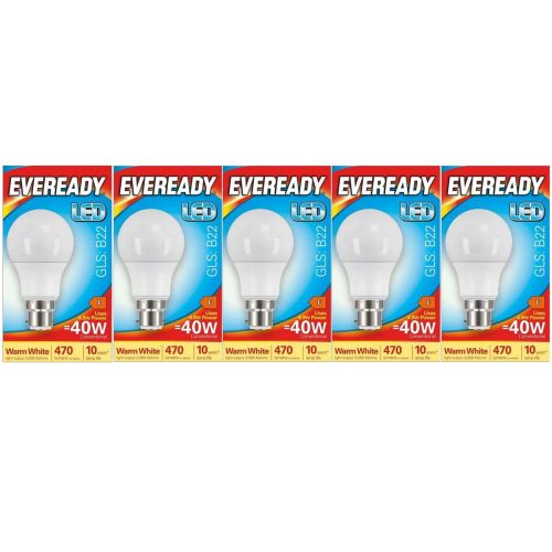 Eveready 5.5W B22 LED GLS Bulb 407 Lumens Warm White Equivalent to 40W Box of 5