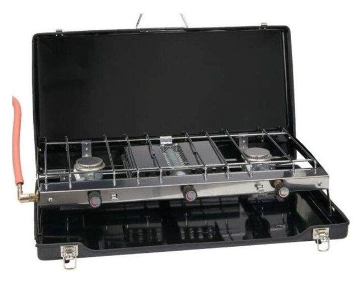 Large double hob and grill family camping stove, that folds into a low profile self-contained case for transport.