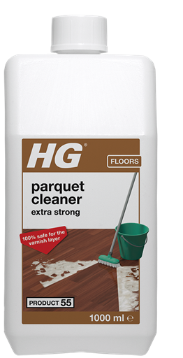 HG parquet power cleaner (p.e. polish remover) (HG product 55) has been specially developed for the fast and easy removal of stubborn dirt and grease from varnished parquet floors. It is also suitable for the removal of polish and other protective films, such as HG parquet protective coatings (HG product 51/52). This product is absolutely safe for the varnish layer.