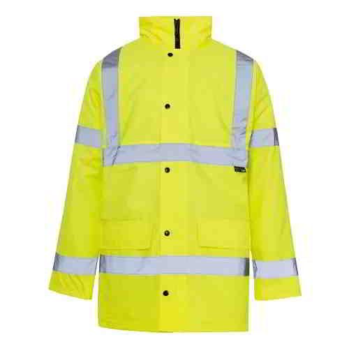 The Hi-Vis Parka Jacket is a 3/4 length jacket with a florescent 300D oxford PU coated 100% waterproof outer shell. A quilted polyester patch lining adds heat and comfort to the jacket. This class 3 parka has reflective stripes over the shoulders and twice around the stomach area. 2 front pockets. The hood folds neatly into the collar and has a drawstring toggle for sealing to your face in extreme conditions.