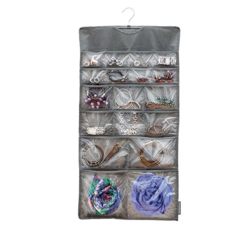 - A double-sided jewellery and accessory organiser with hanger and 36 different-sized transparent pockets (18 on each side), allowing you to see the contents quickly and easily.