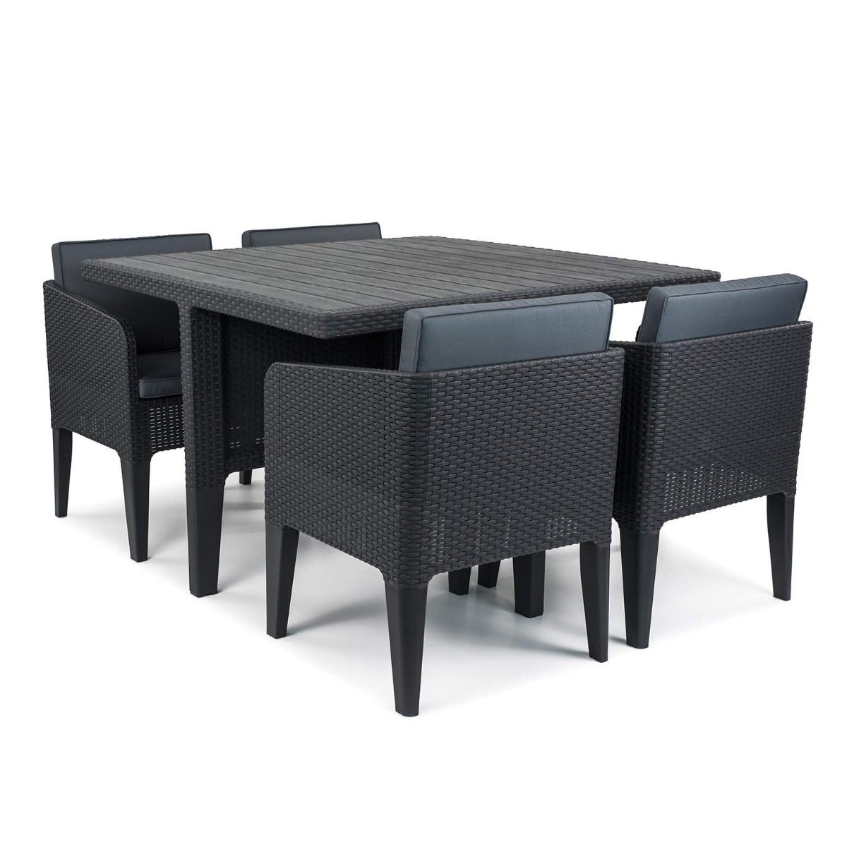 This durable and stylish Outdoor Garden Dinign Set from Keter comes with a 1.17m square table and 4 seats.