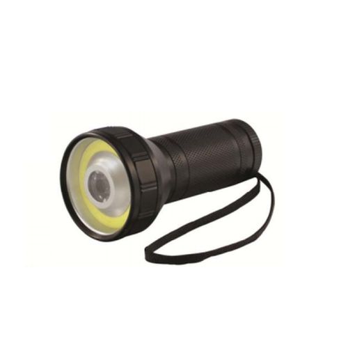 - This flashlight is manufactured with a durable weatherproof aluminium housing, 12 bright white COB’s & one LED bulb, simple press on/off button & handy wrist strap.