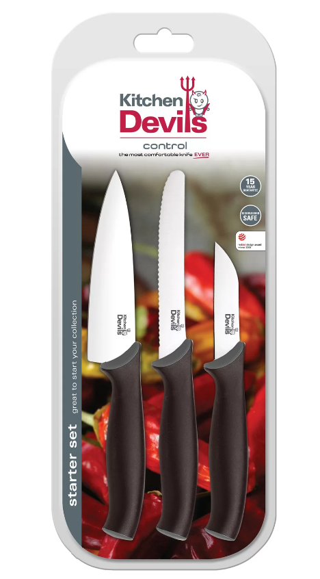 A multi purpose collection of handy knives featuring a paring knife, multi-purpose knife and small cook’s knife.