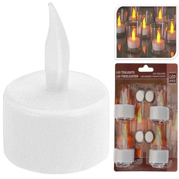 - Pack includes 4 tealights and 4 CR2032 batteries