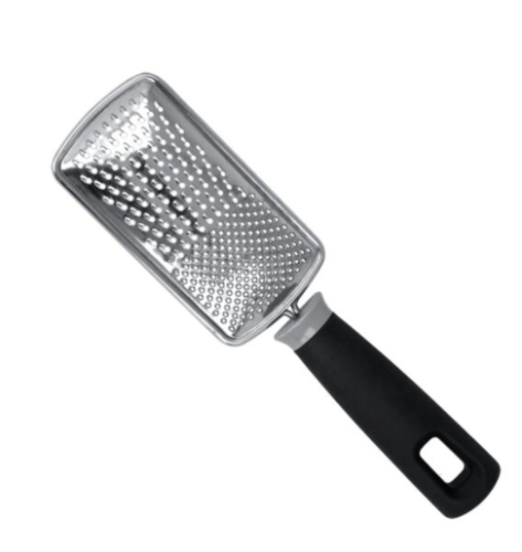 - Curved stainless steel grater.