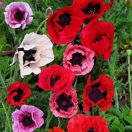 - A breathtaking semi-dwarf mixture producing robust plants with red, orange, salmon, mauve, rose, pink and white flowers 15-20cm (6-8") across, all with a distinctive black centre.