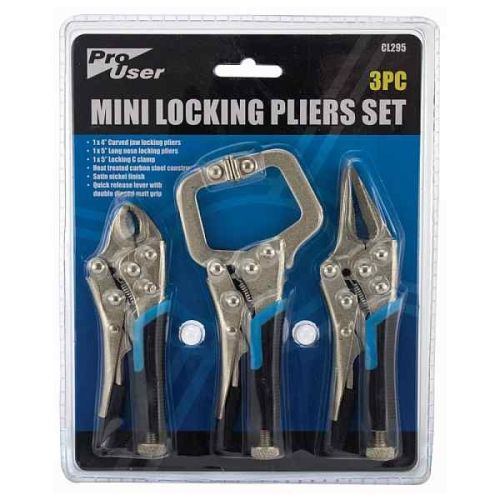 - Includes: 1 x 4" curved jaw locking pliers, 1 x 5" long nose locking pliers, 1 x 5" locking C clamp