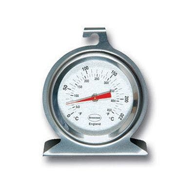 - 50mm stainless steel dial oven thermometer with black temperature scale. Suitable for hanging or sitting on oven shelf