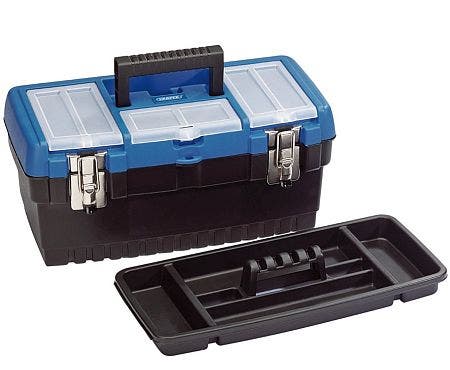 Impact - resistant polypropylene with three storage compartments in lid. Fitted with sturdy carrying handle, two metal closing latches and a padlock eye for security. The removable tote tray measures 395 x 160 x 35mm.