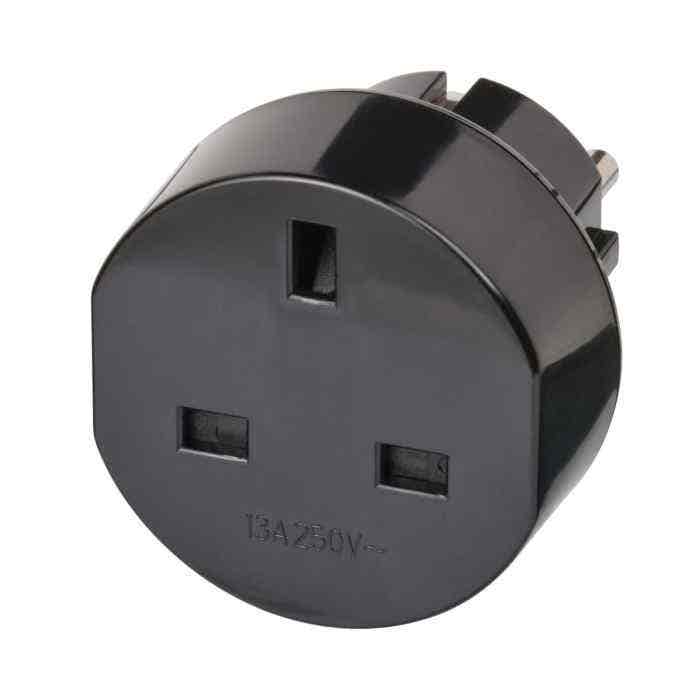 - 1-piece protective contact travel plug for connecting electrical devices with plug system from England, for sockets with protective contact