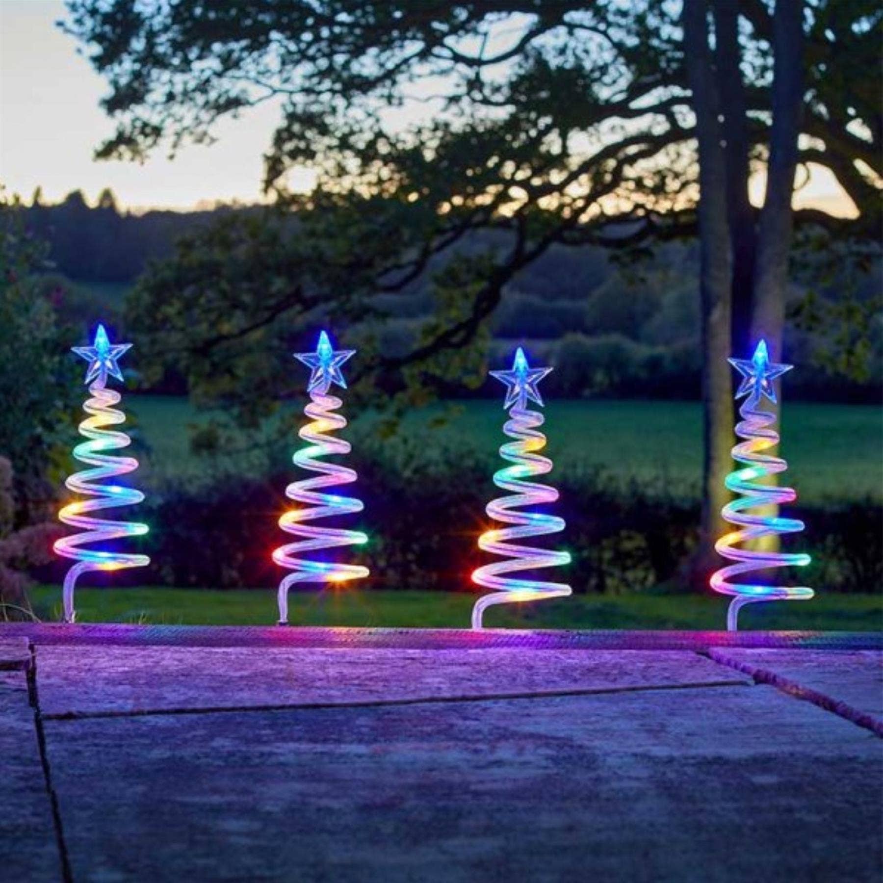 TreeSpiral Stakes Multi-Coloured LED Lights – Set of 4 Battery Powered Christmas Pathway and Garden Decorations with Auto Timer