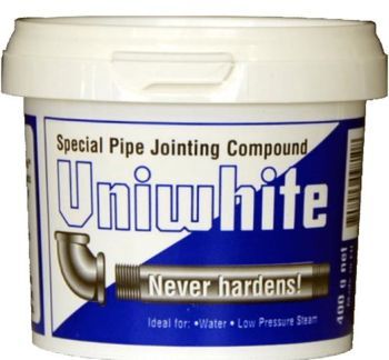 - UNIWHITE jointing compound applied together with flax/hemp provides 100% tight threaded pipe joints and facilitates connection and future disconnection of the joints. Application of UNIWHITE jointing compound - contrary to e.g.thread seal tape - also provides a large adjusting flexibility as the pipe joints remain tight when loosened. It is suitable for use with Natural & Liquified Petroleum Gas.