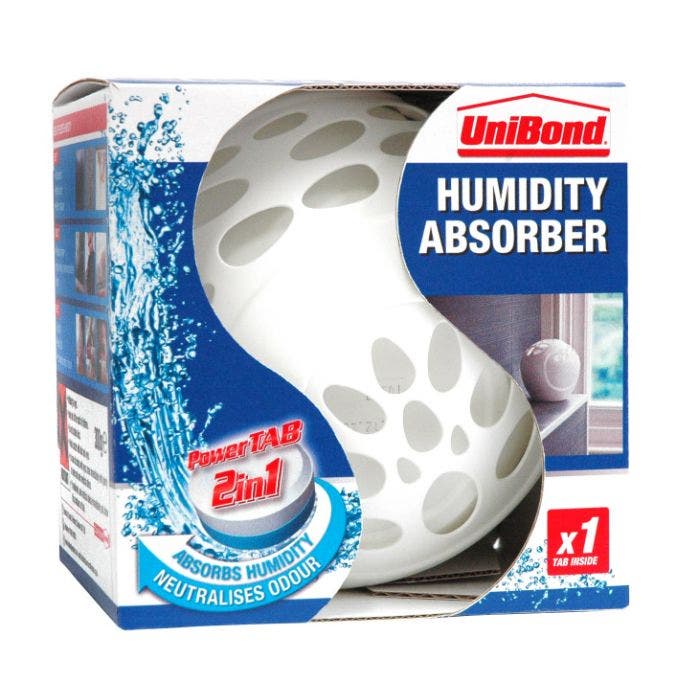 This UniBond Humidity Absorber uses a natural process to absorb excess moisture from the air. The 2 in 1 Power tab contains active layers that absorb excess humidity and neutralise bad odours, with no spills or noise and no electricity needed. This humidity absorber is ideal for large rooms up to 10m².