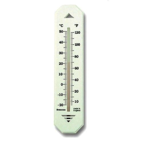 - Plastic wall thermometer with clear, black printed scale on white moulding.